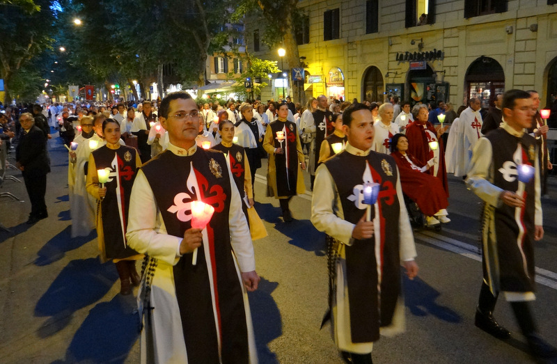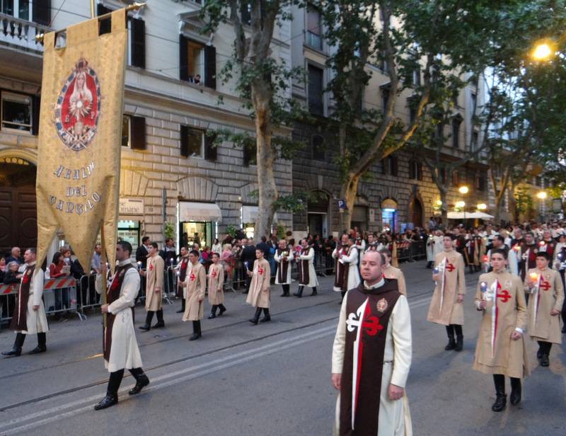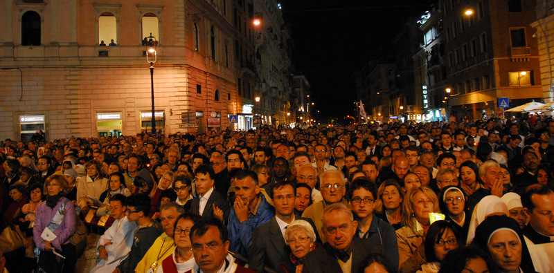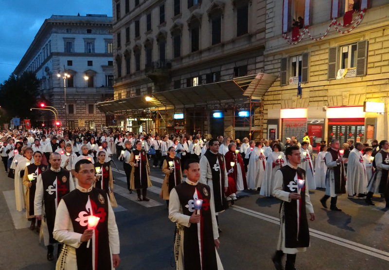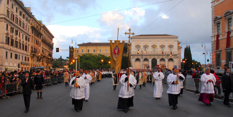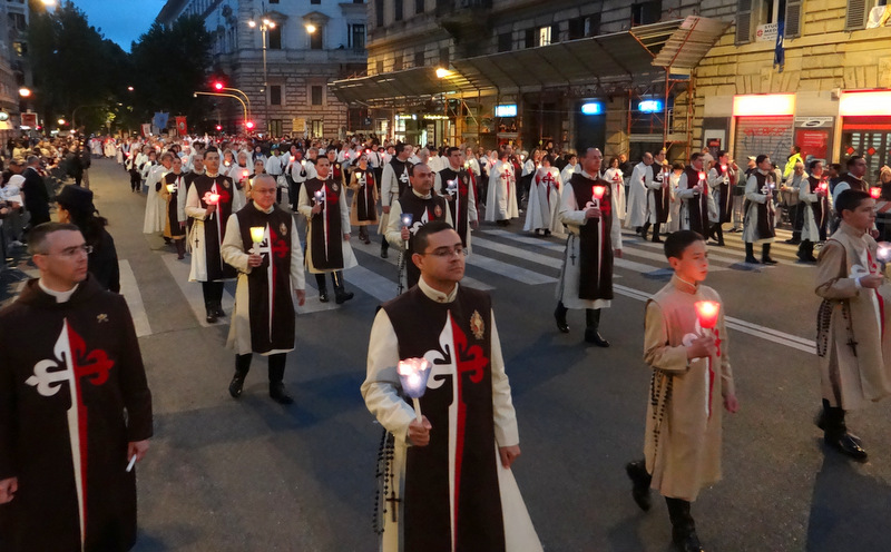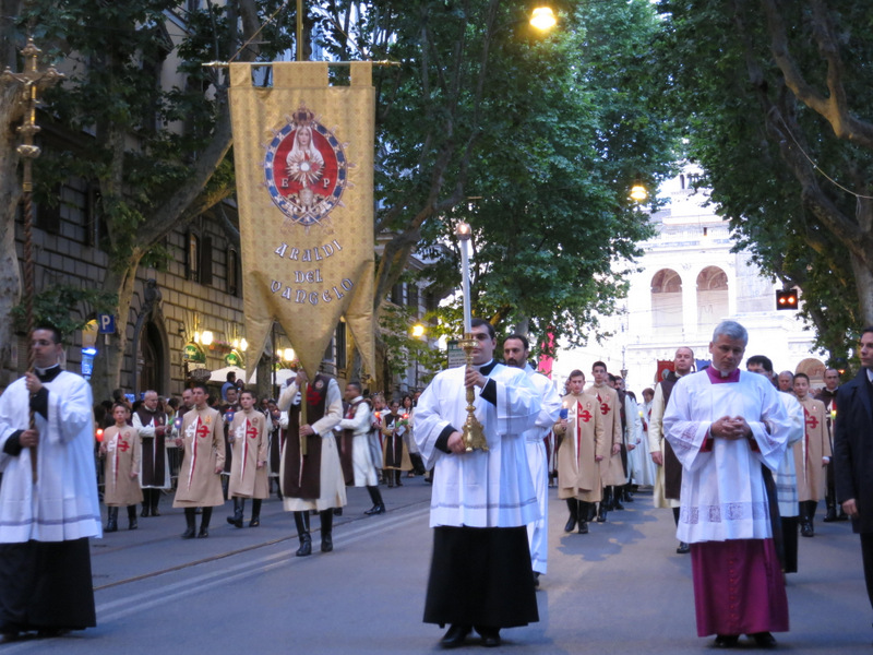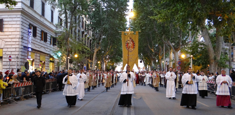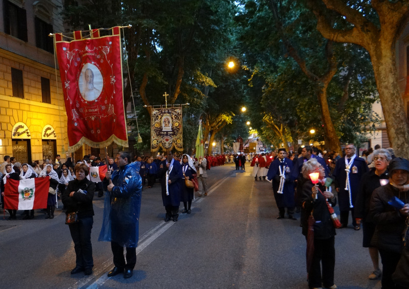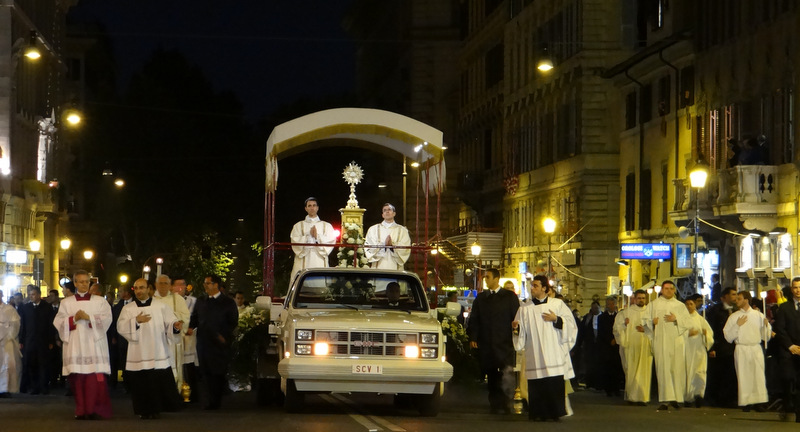 Nonostante il cielo minacciasse pioggia, egli ha percorso le strade della città eterna a piedi, per circa un miglio, a seguito di un altare mobile che è stato installato in custodia. La processione si è svolta in pieno raccoglimento , animata da canti e preghiere che giungevano lungo le vie dagli altoparlanti che erano stati precedentemente installati.