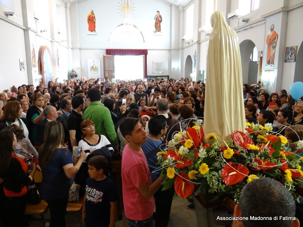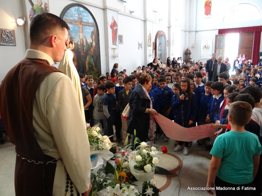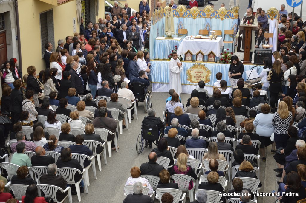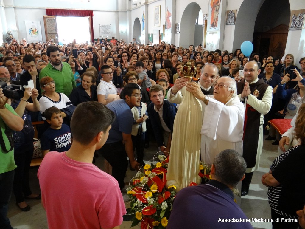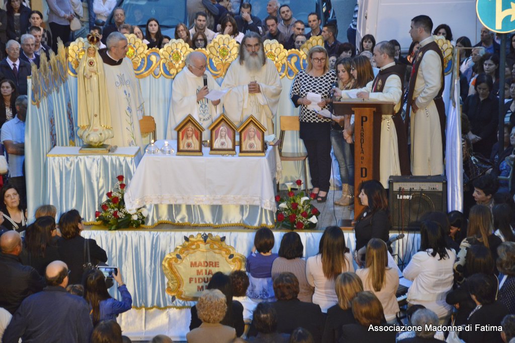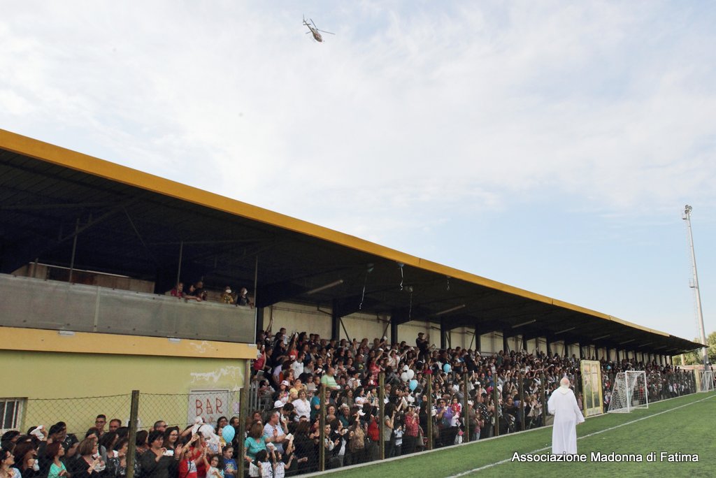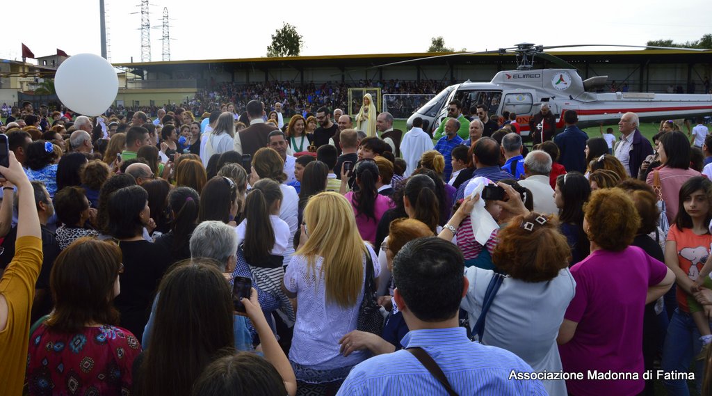La Madonna, portata dall’elicottero della protezione civile è giunta al campo sportivo gremito di fedeli. Uno scenario  meraviglioso di viva fede Mariana . Un numeroso gruppo di fedeli ha accolto dando un caloroso  benvenuto   la Madonnina Pellegrina di Fatima, accompagnata dai quattro Araldi del Vangelo, dal parroco D. Carmelo Ascone, dal vice parroco D. Rosario Attisano, dal diacono Mimmo Sarreti, dalle Suore e dal collaboratore parrocchiale Daniele Coppola. Presenti anche  le autorità civili nella persona del Sindaco e dell’Assessore Michele Fabrizio. La folla immensa presente nel campo sportivo , con in mano fazzoletti  bianchi ha elevato   al cielo melodiosi canti Mariani accogliendo festante  la Mamma nostra discesa dal Cielo.