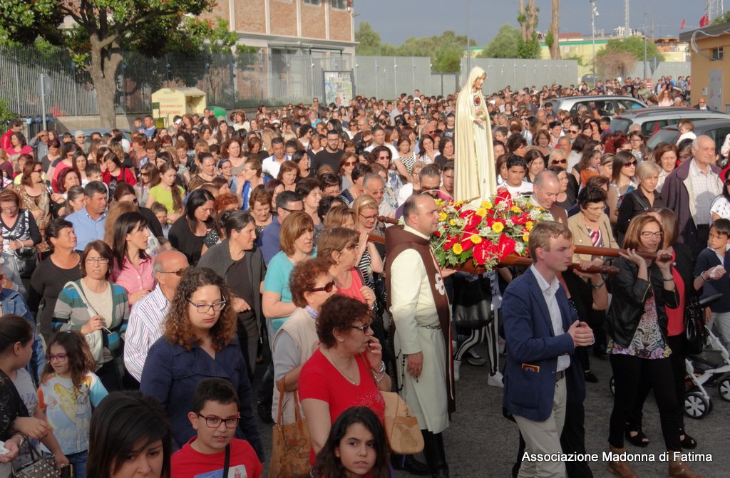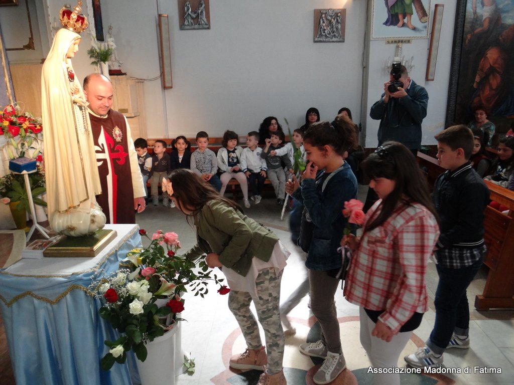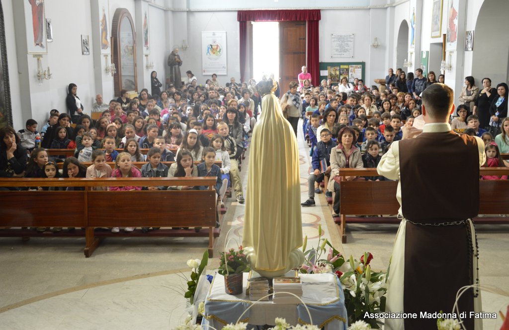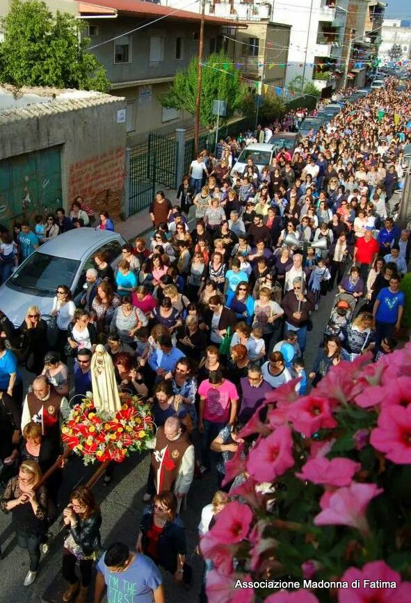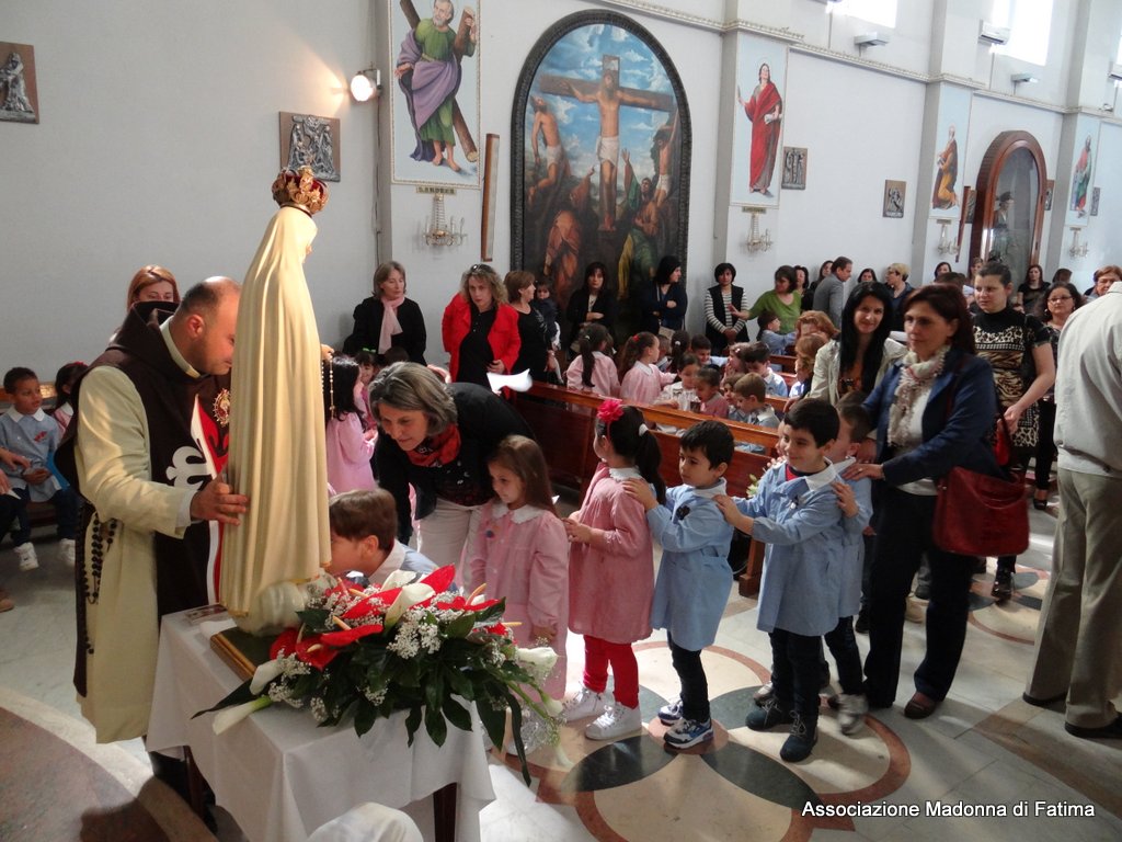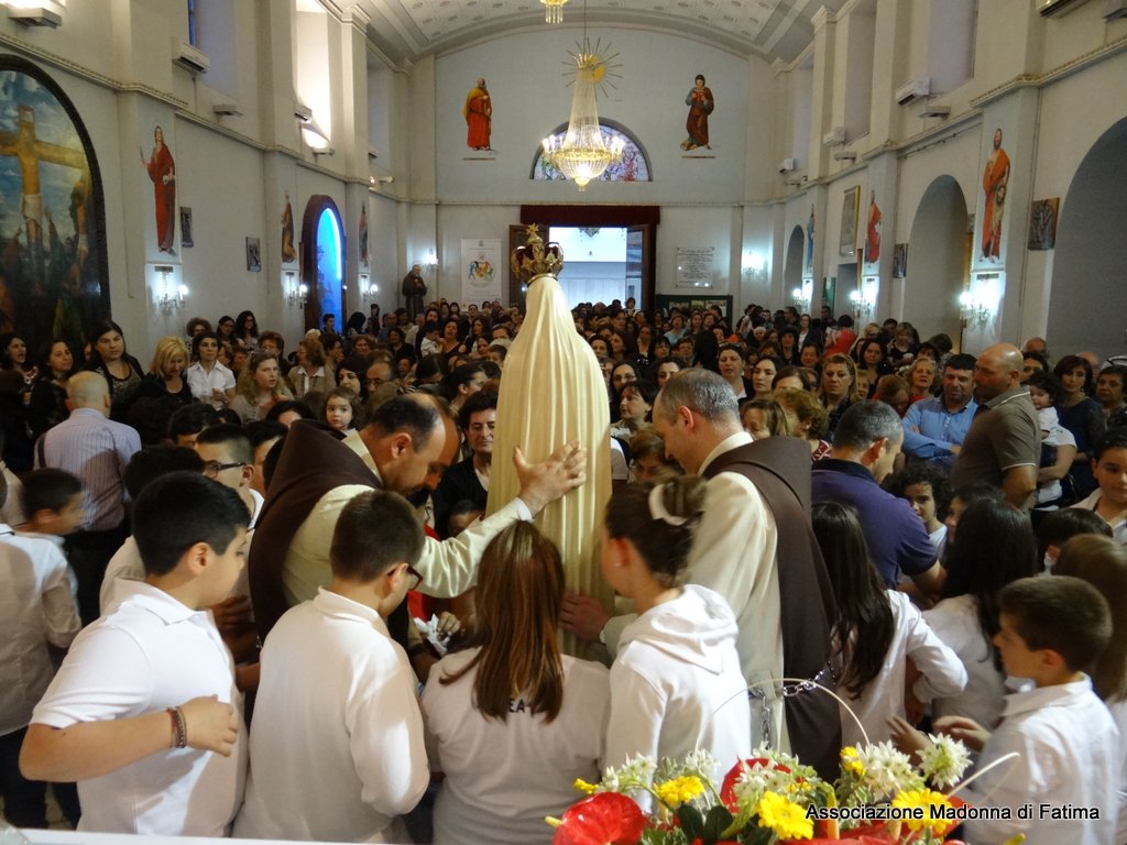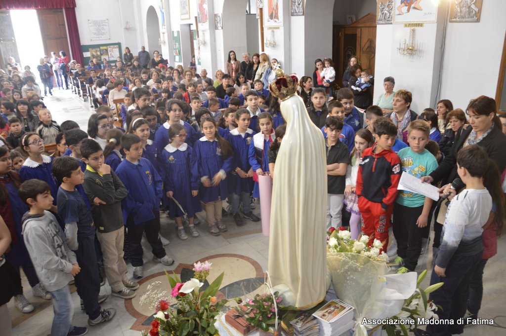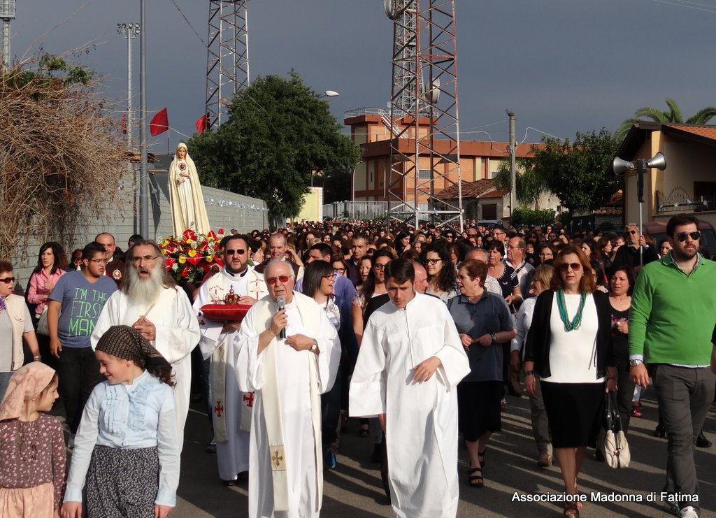 La Madonna, portata dall’elicottero della protezione civile è giunta al campo sportivo gremito di fedeli. Uno scenario  meraviglioso di viva fede Mariana . Un numeroso gruppo di fedeli ha accolto dando un caloroso  benvenuto   la Madonnina Pellegrina di Fatima, accompagnata dai quattro Araldi del Vangelo, dal parroco D. Carmelo Ascone, dal vice parroco D. Rosario Attisano, dal diacono Mimmo Sarreti, dalle Suore e dal collaboratore parrocchiale Daniele Coppola. Presenti anche  le autorità civili nella persona del Sindaco e dell’Assessore Michele Fabrizio. La folla immensa presente nel campo sportivo , con in mano fazzoletti  bianchi ha elevato   al cielo melodiosi canti Mariani accogliendo festante  la Mamma nostra discesa dal Cielo.